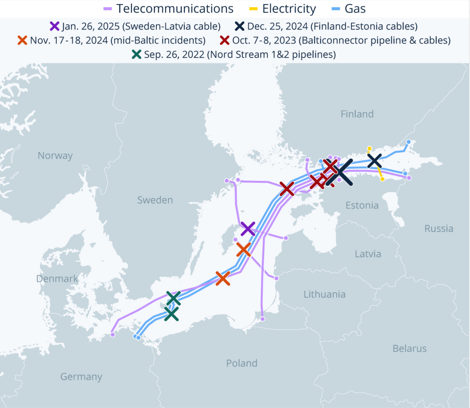 A string of disruptions to undersea cables in the Baltic Sea has heightened concerns over the security of critical infrastructure. Since October 2023, at least 11 subsea cables have been damaged across the region. In November 2024, the C-Lion1 cable between Finland and Germany which carries 120 Terabytes per second and the BCS East-West Interlink between Lithuania and Sweden were severed almost simultaneously, raising suspicions of coordinated sabotage. The cutting of the BCS cable led to it being taken out of service prematurely.